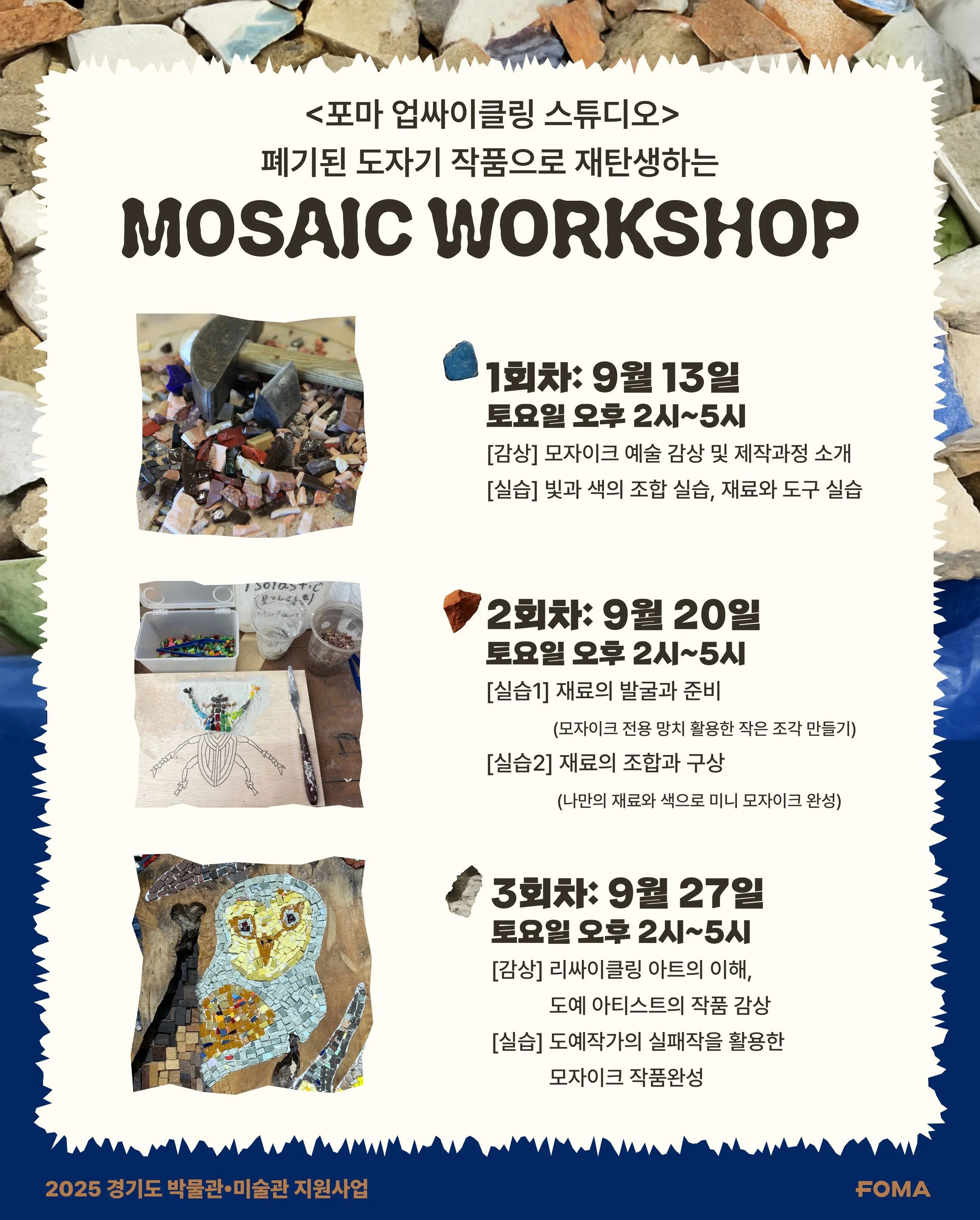 폐기된 재료를 예술품으로 재탄생시키는 모자이크 워크샵 지금 신청하세요. 9월 13일, 9월 20일, 9월 27일 3회차의 수업이 준비되어 있습니다.